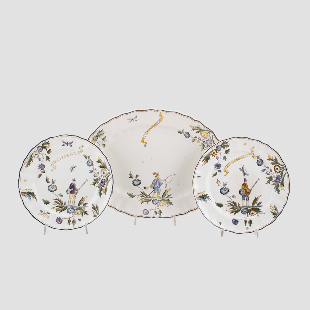 coppia di piatti e piatto da portata serie Ermione in terraglia policroma, marchio della manifattura, lievi usure