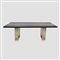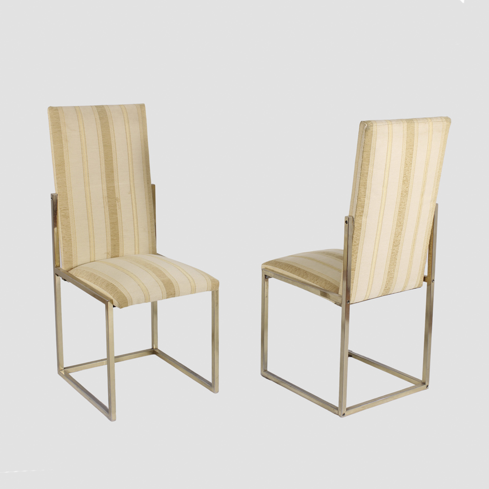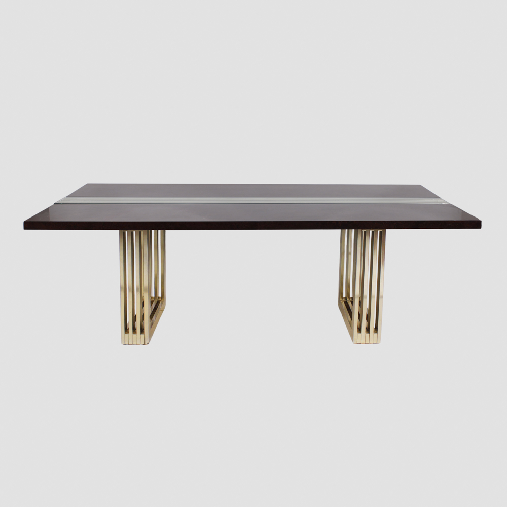 tavolo in radica, vetro trasparente, acciaio ed acciaio dorato con otto sedie in acciaio dorato e tessuto imbottito