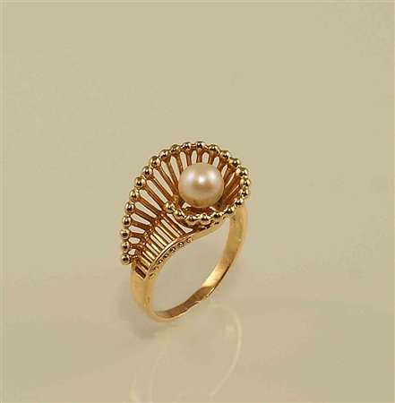 Anello in oro rosso 18kt con incastonata una perla coltivata di mm. 6 circa, anni 50/60, gr. 6.
