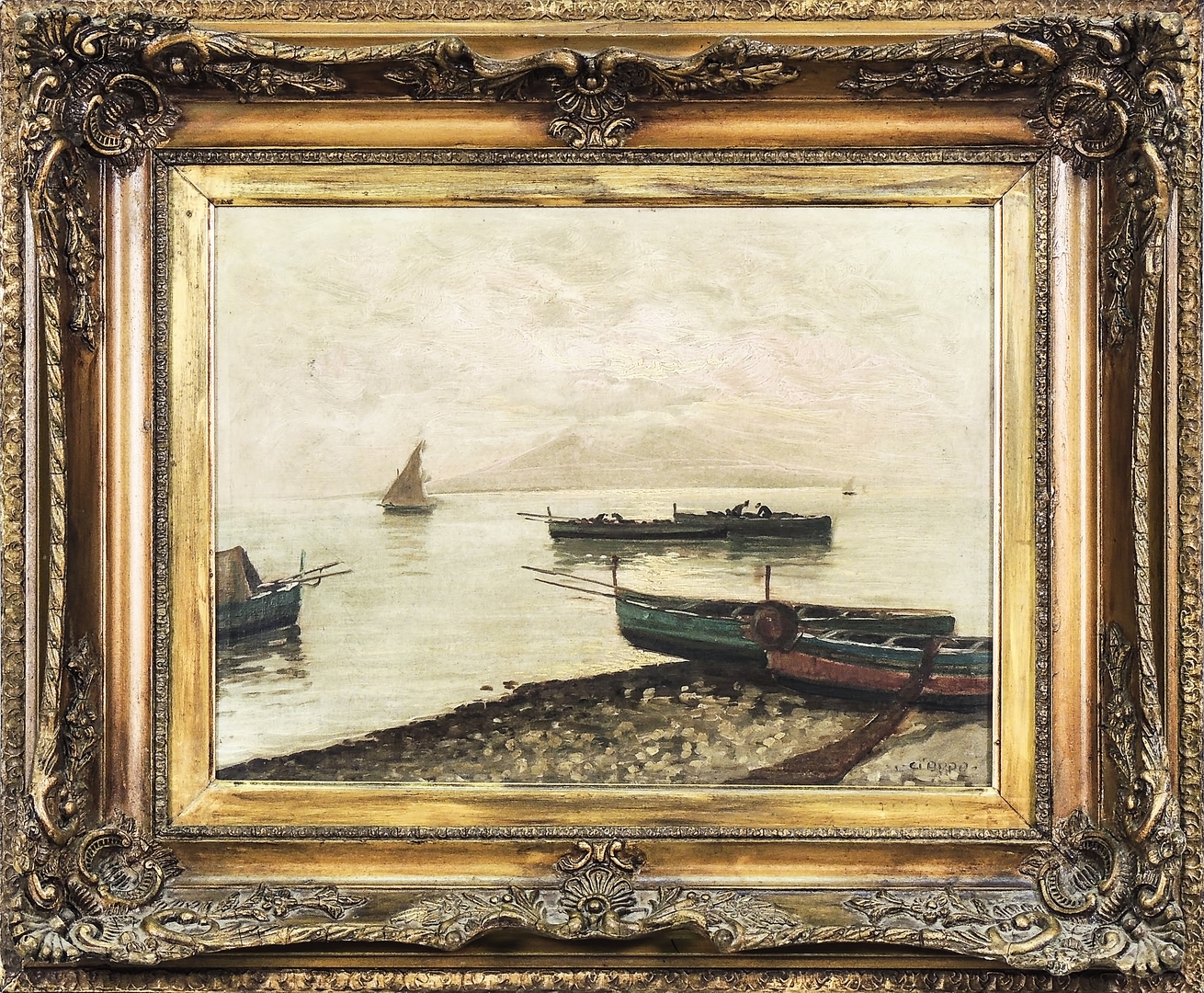 GIOVANNI CIAPPO (attivo nel XX secolo) Paesaggio marino con barche - Seascape with Boats olio su tela - oil on canvas, firmato, in cornice cm 30x40