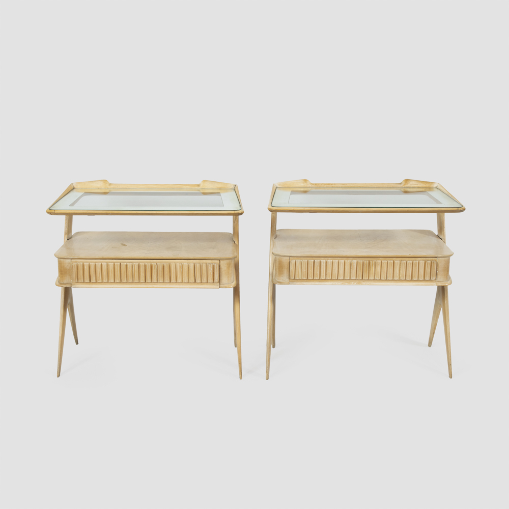 coppia di comodini in legno, vetro specchiato e trasparente, lievi usure