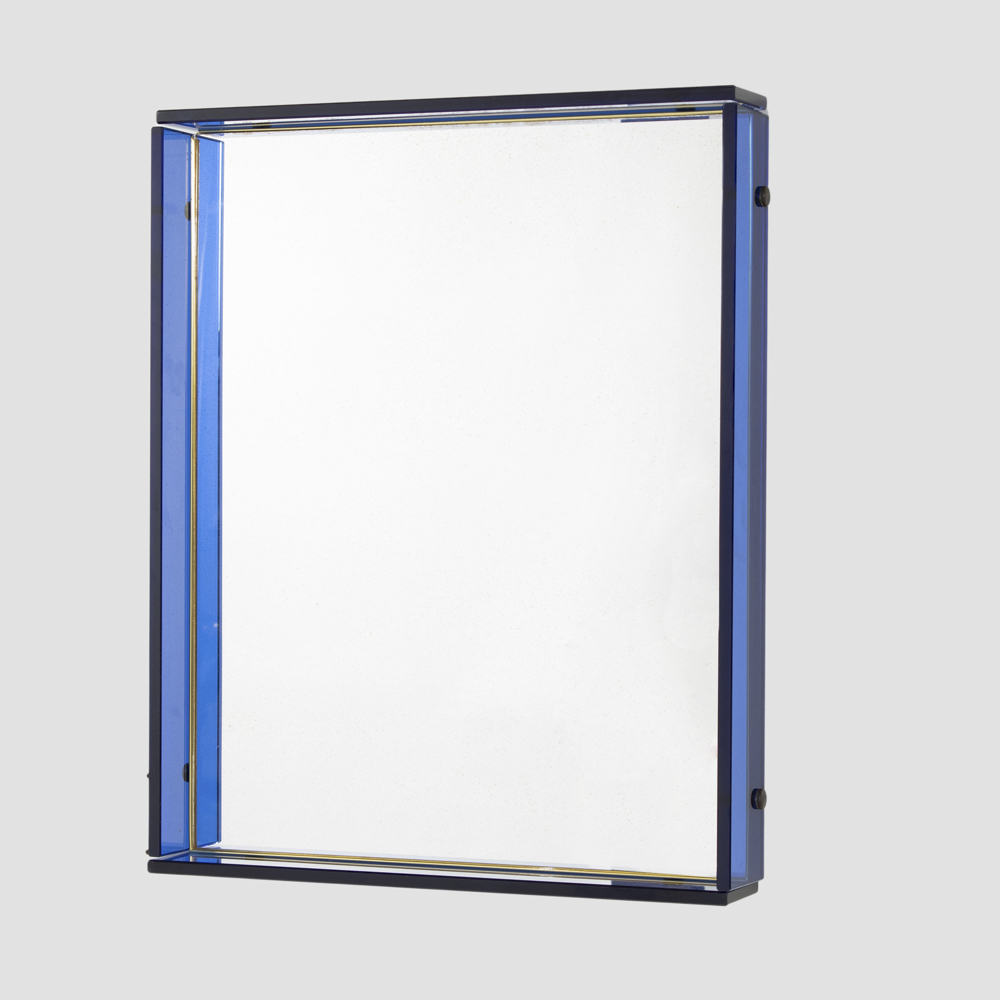 specchio da parete in ottone, vetro colorato e specchiato, etichetta della produzione