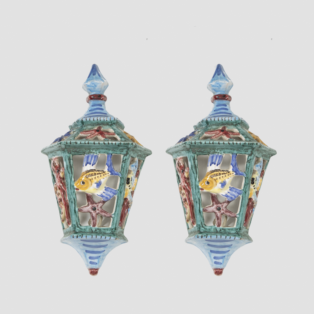 coppia di lampade da parete in ceramica policroma