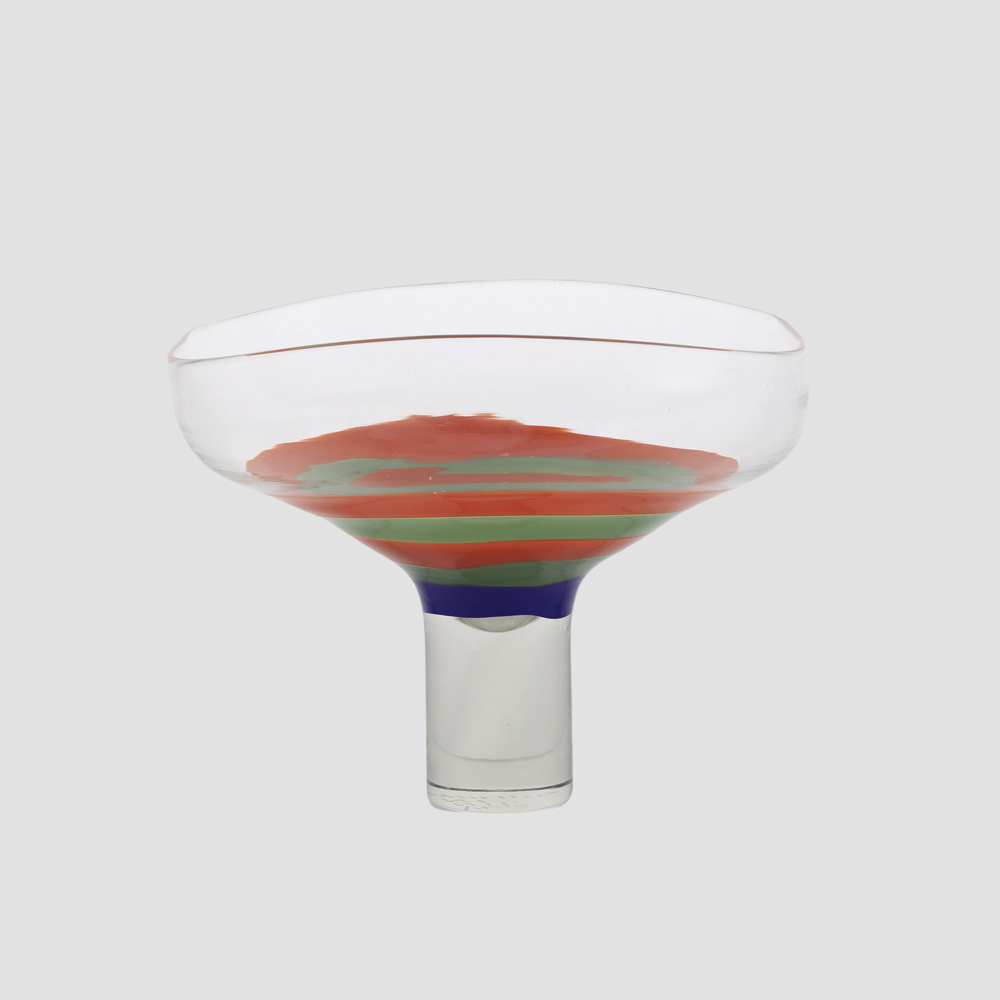 coppa in vetro trasparente con decoro a fasce policrome concentriche e piede massiccio, firma a punta.