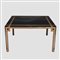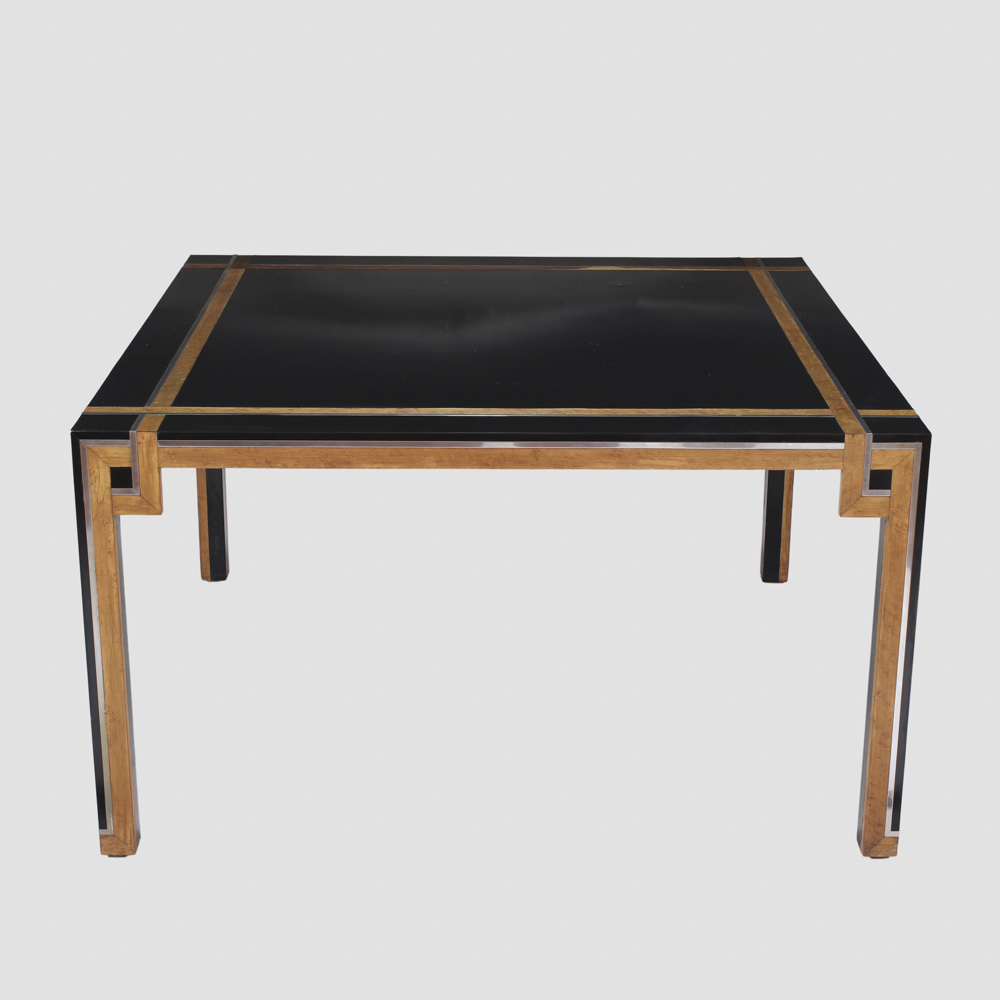tavolo quadrato in legno dipinto, metallo e radica, lievi usure