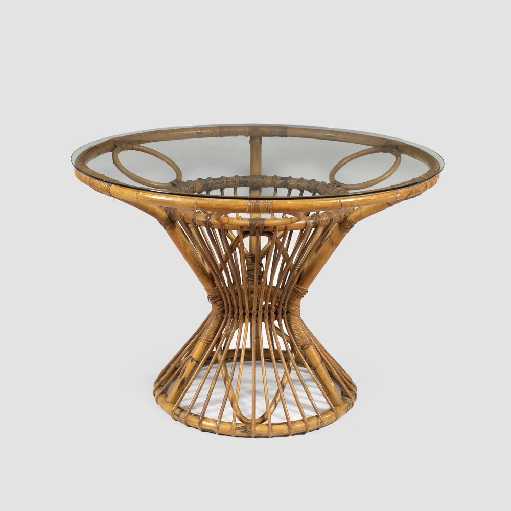 tavolo circolare in rattan, midollino, bambù e vetro trasparente