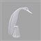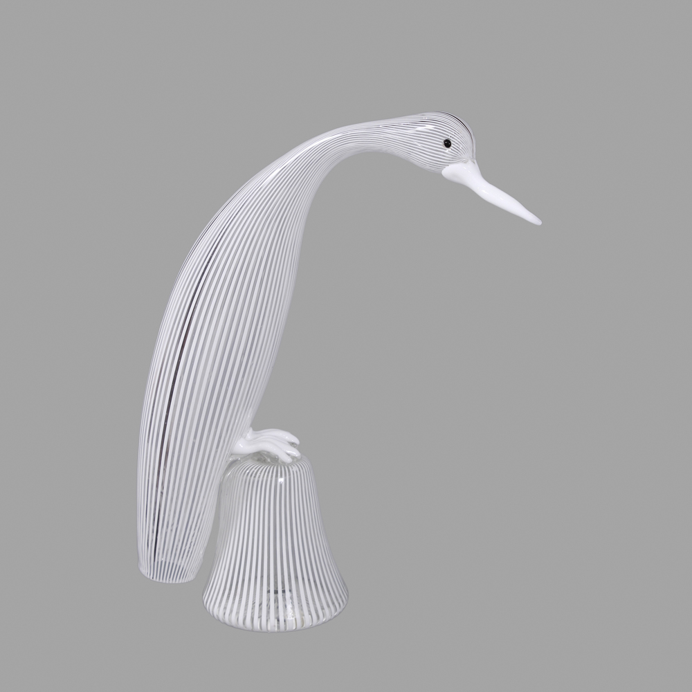 uccello acquatico mod. 2779 in vetro a canne filigranate lattimo con fascia sommersa in ametista scuro sul dorso, firma all'acido, etichetta della produzione.