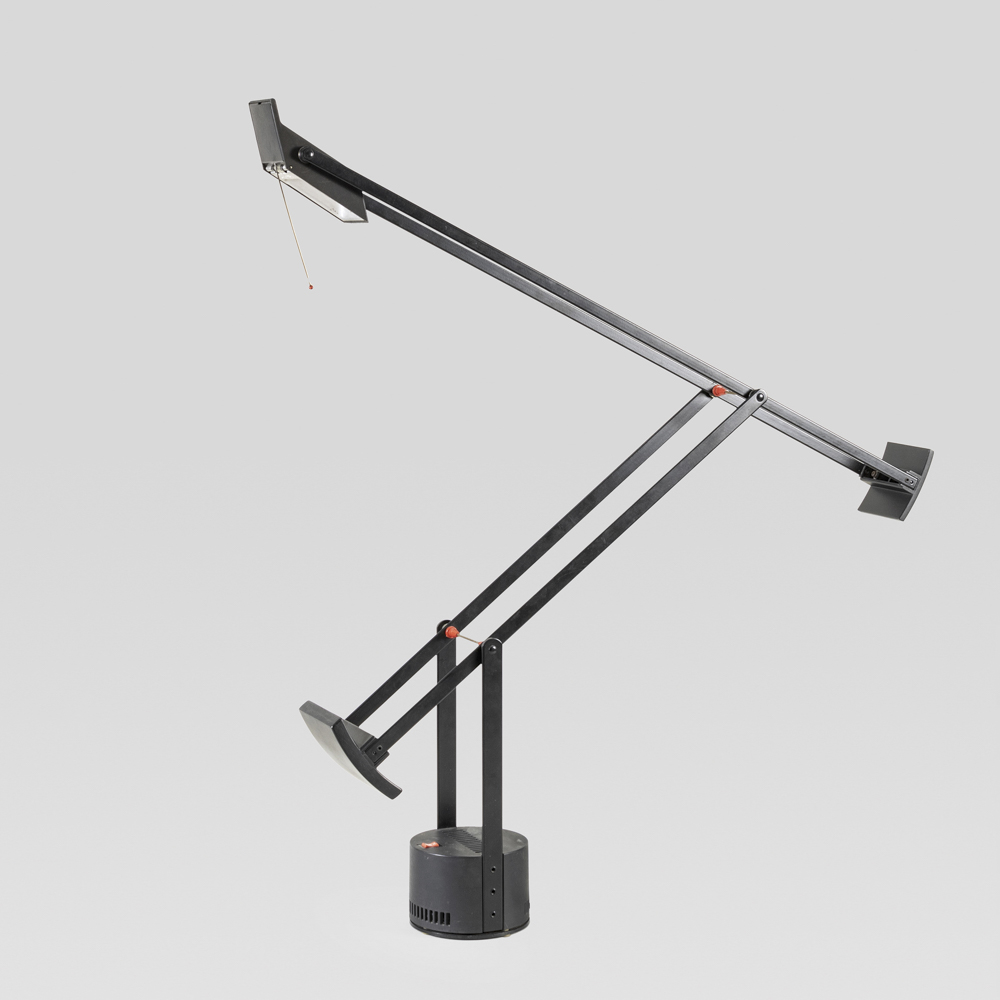 lampada da tavolo mod. Tizio in alluminio nero, marchio della produzione.