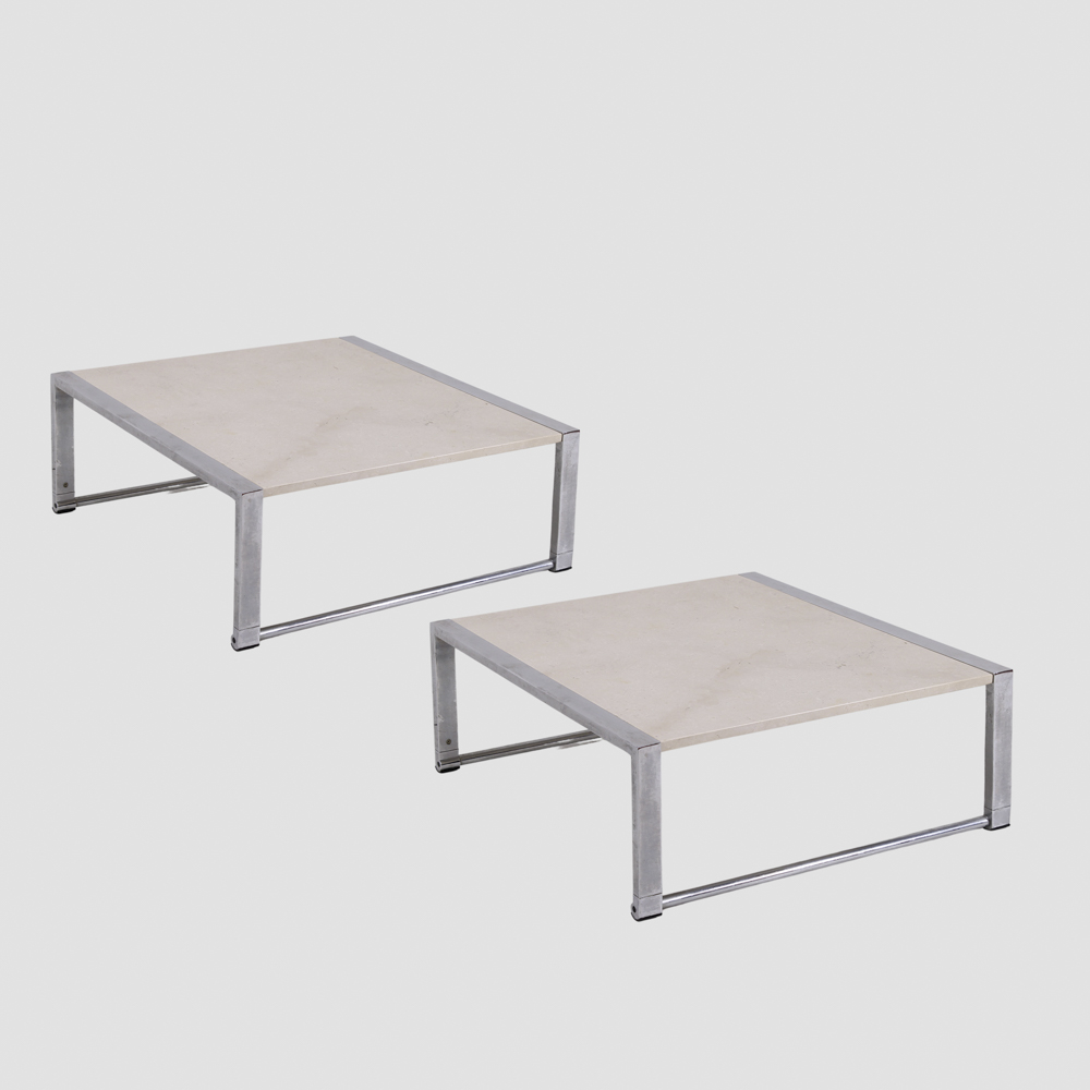 coppia di tavolini in acciaio e marmo, etichetta della produzione