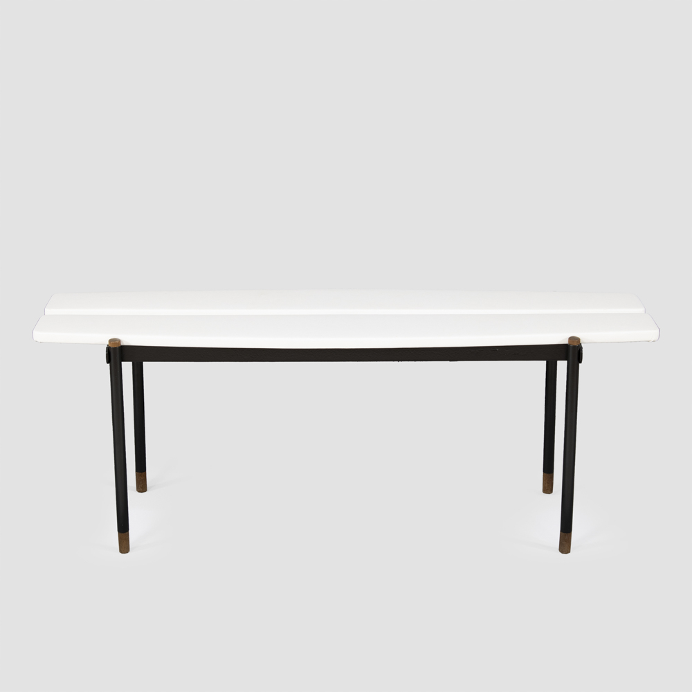 panca in metallo verniciato, ottone e tessuto imbottito
