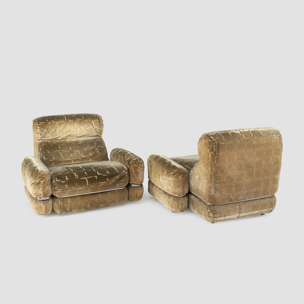 coppia di poltrone in acciaio cromato e tessuto imbottito