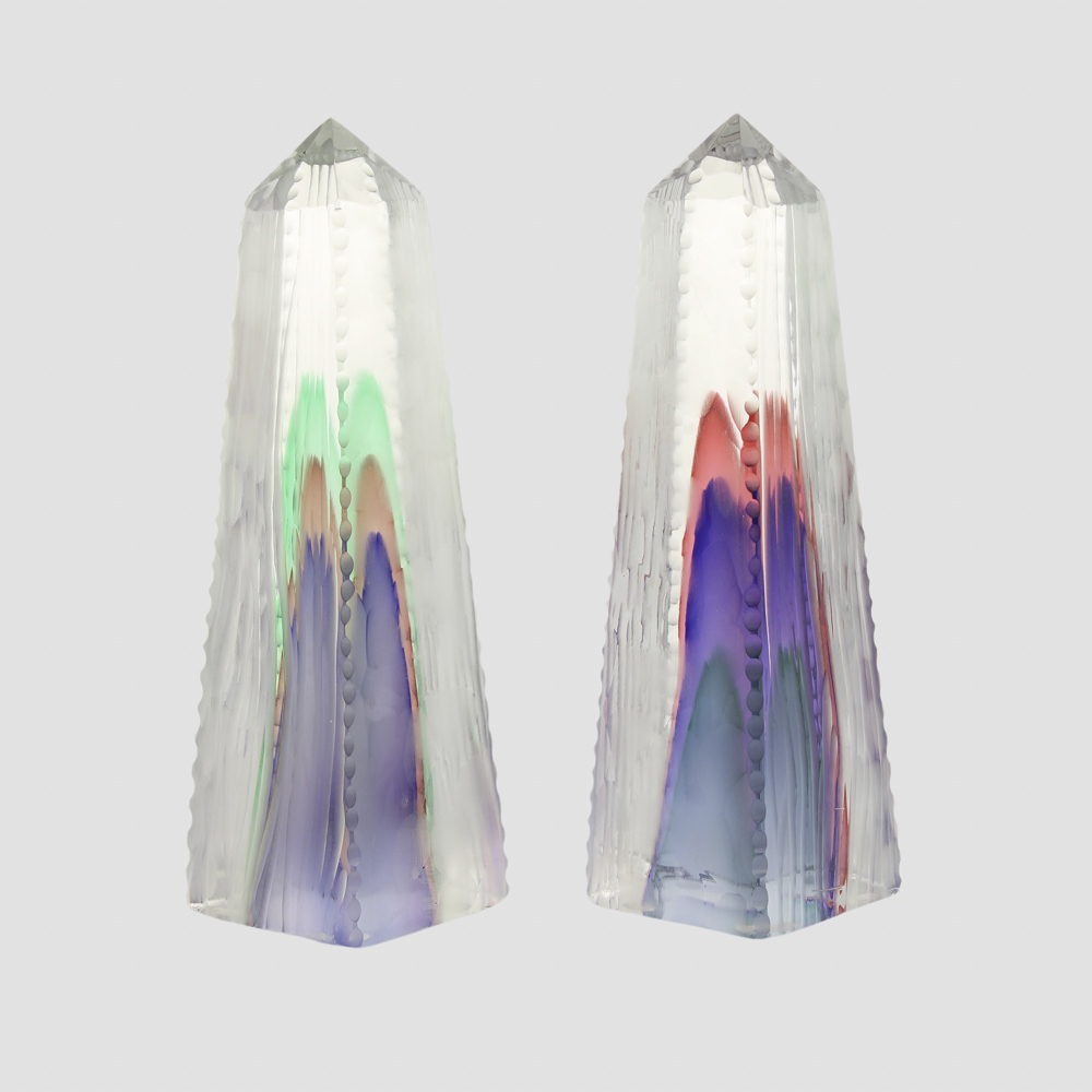 coppia di obelischi in vetro inciso e sommerso, firma a punta