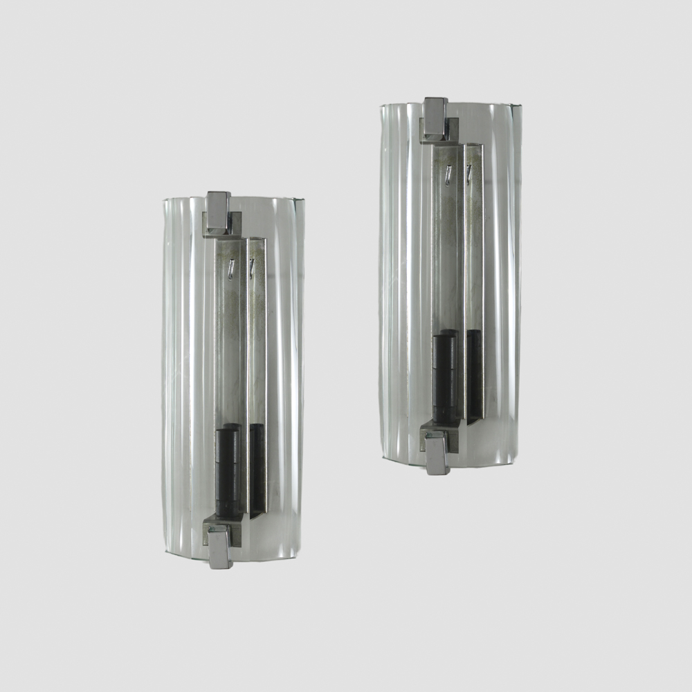 coppia di lampade da parete in vetro trasparente ed acciaio, etichetta della produzione