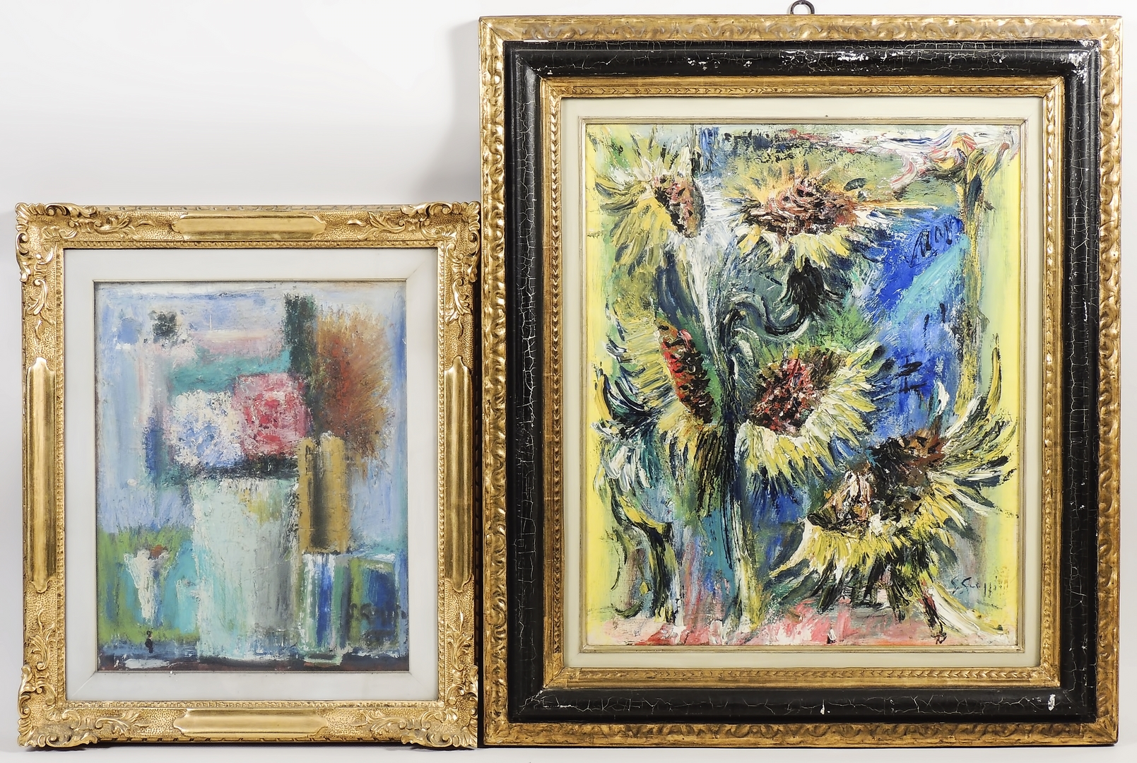 SPARTACO GREGGIO (1893-1979) Fiori - Flowers due dipinti ad olio su tela - two oils on canvas, firmati, in cornice, uno con difetto (2) cm 50x40 e cm 66x54