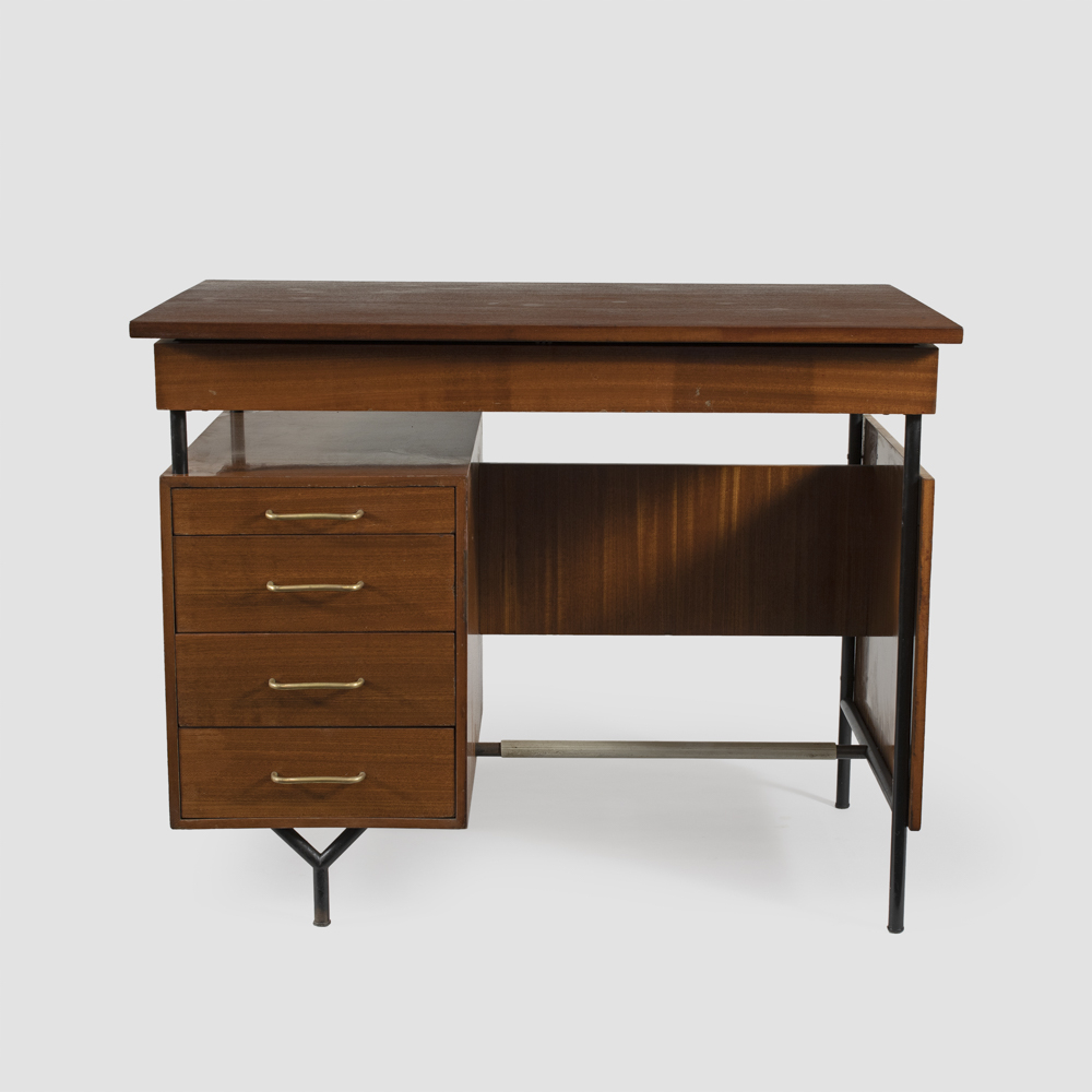 scrivania in legno, ottone e metallo verniciato, marchio della produzione