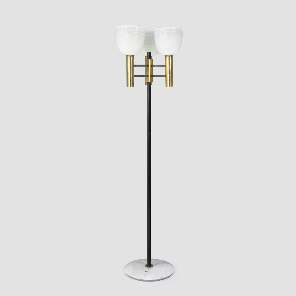 lampada da terra in ottone, metallo verniciato, vetro a bollicine, base in marmo, lievi difetti