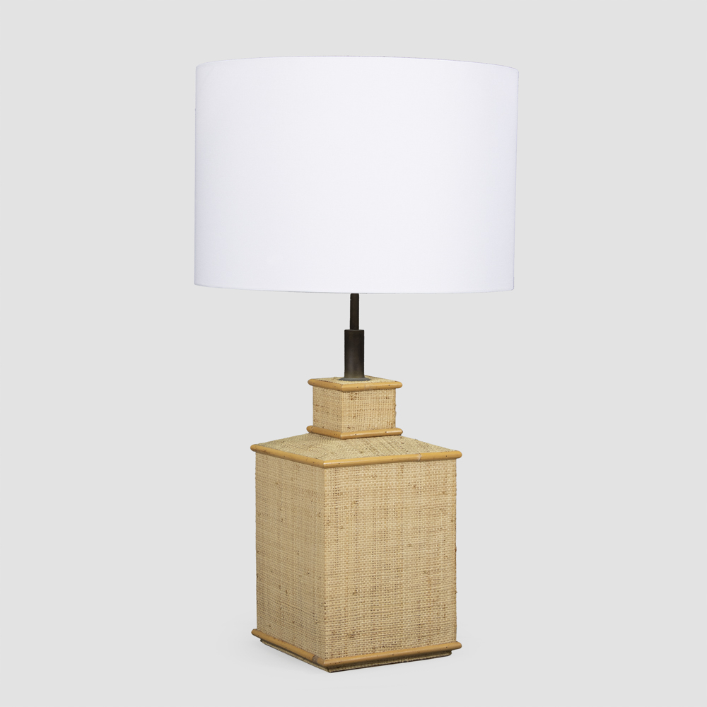 lampada da tavolo in ottone, paglia e bambù, completa di paralume