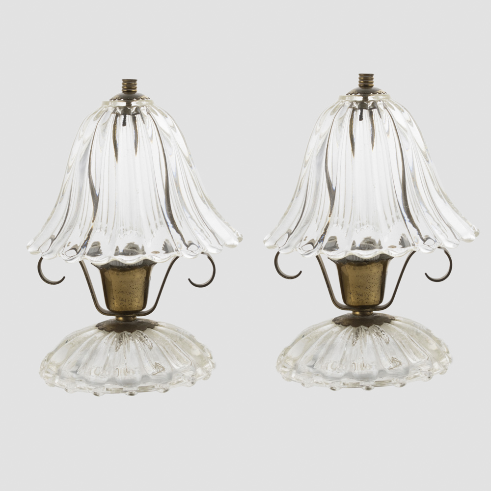 coppia di lampade da tavolo in ottone e vetro trasparente