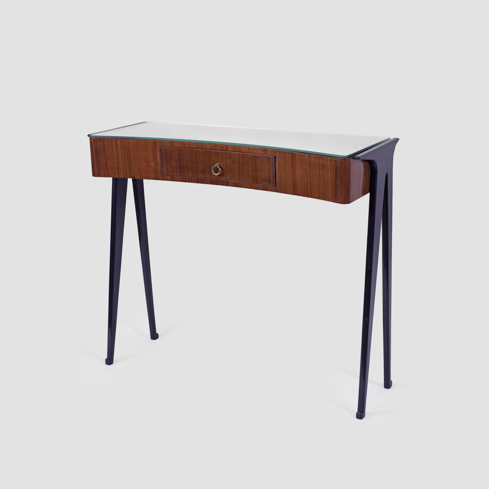console in legno, ottone e vetro specchiato
