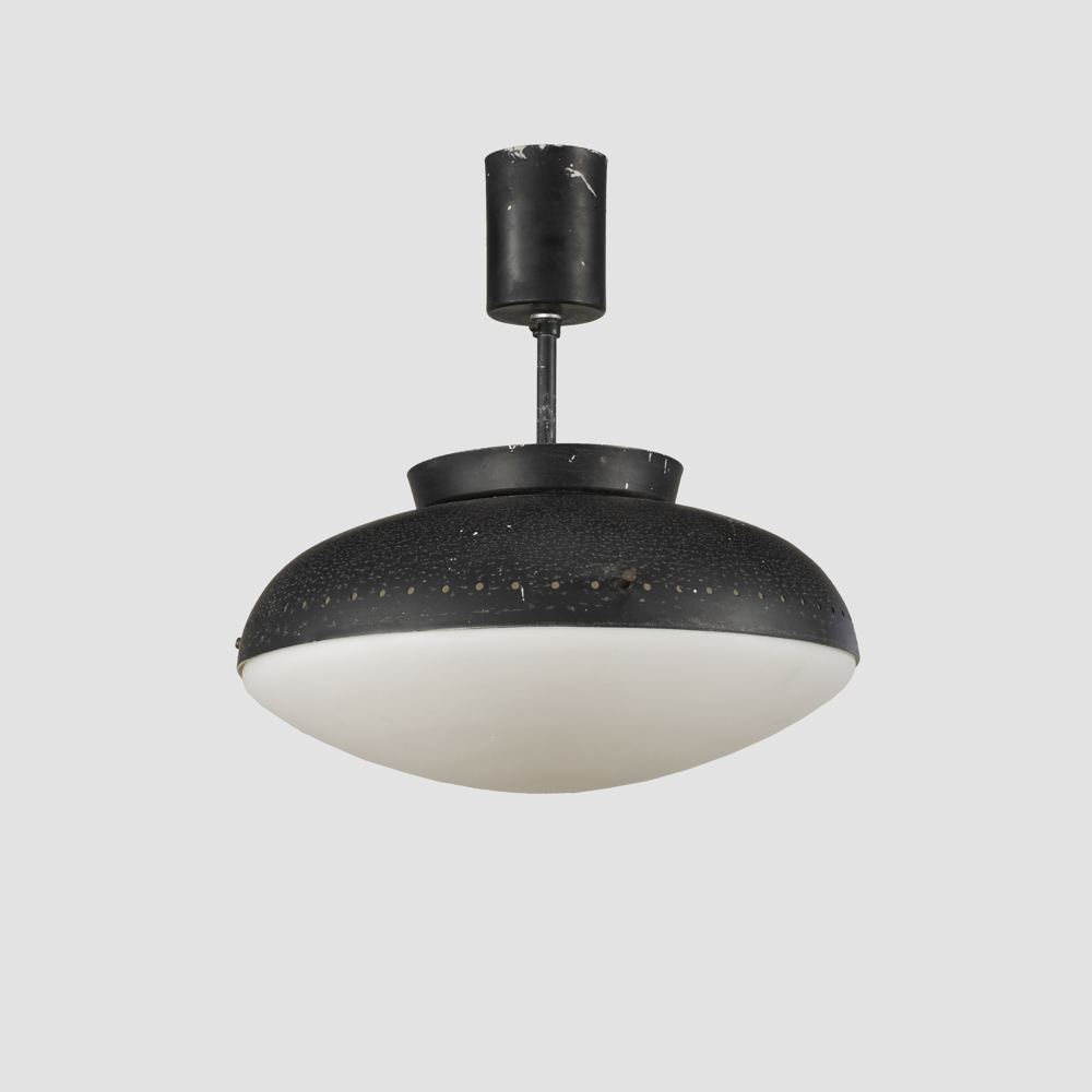 lampada a sospensione in ottone, metallo verniciato e vetro satinato, usure