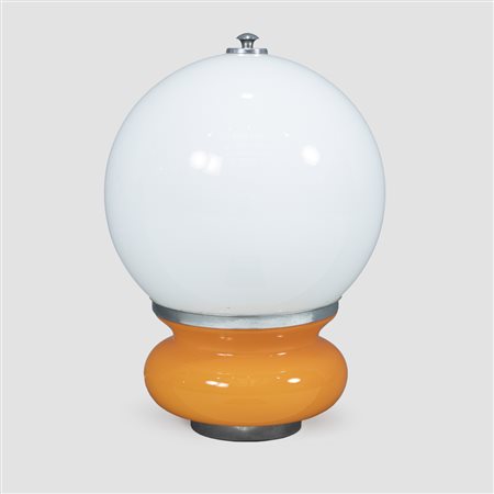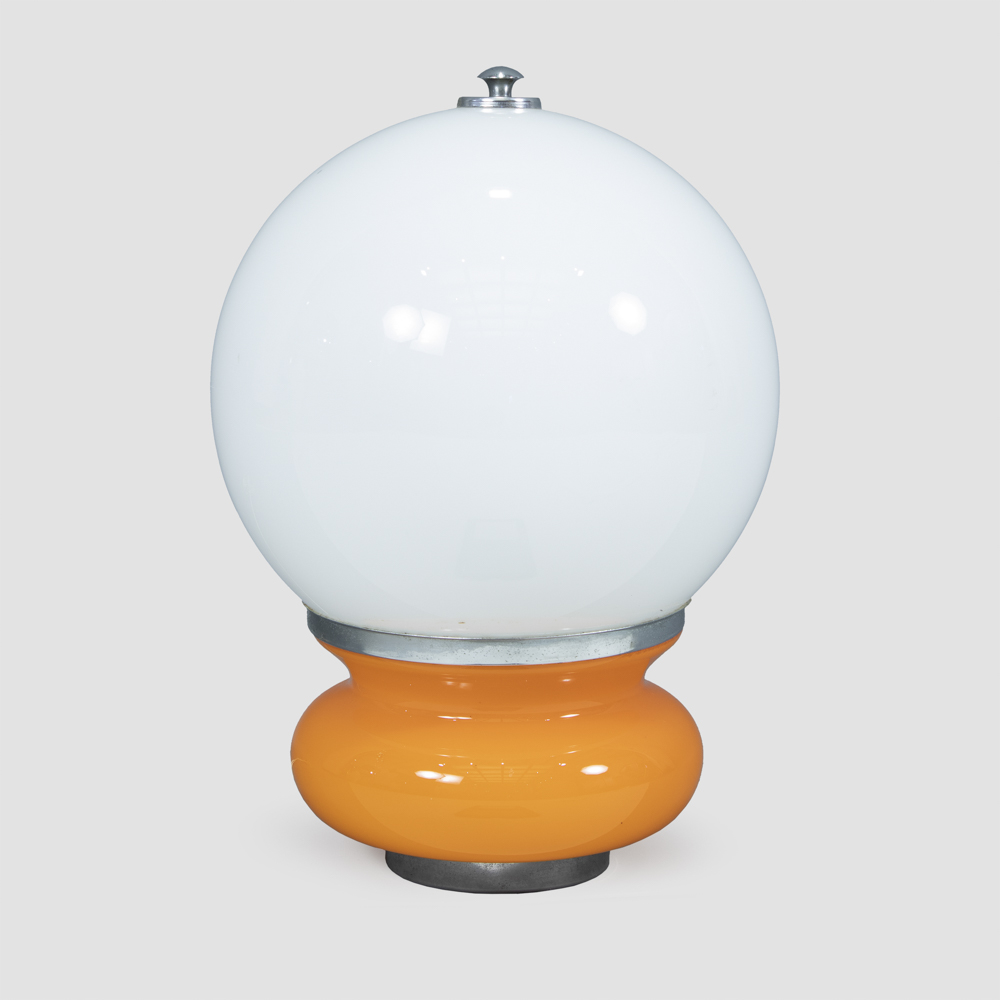 lampada da tavolo in acciaio, vetro colorato e vetro lattimo