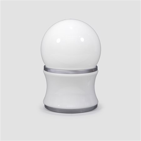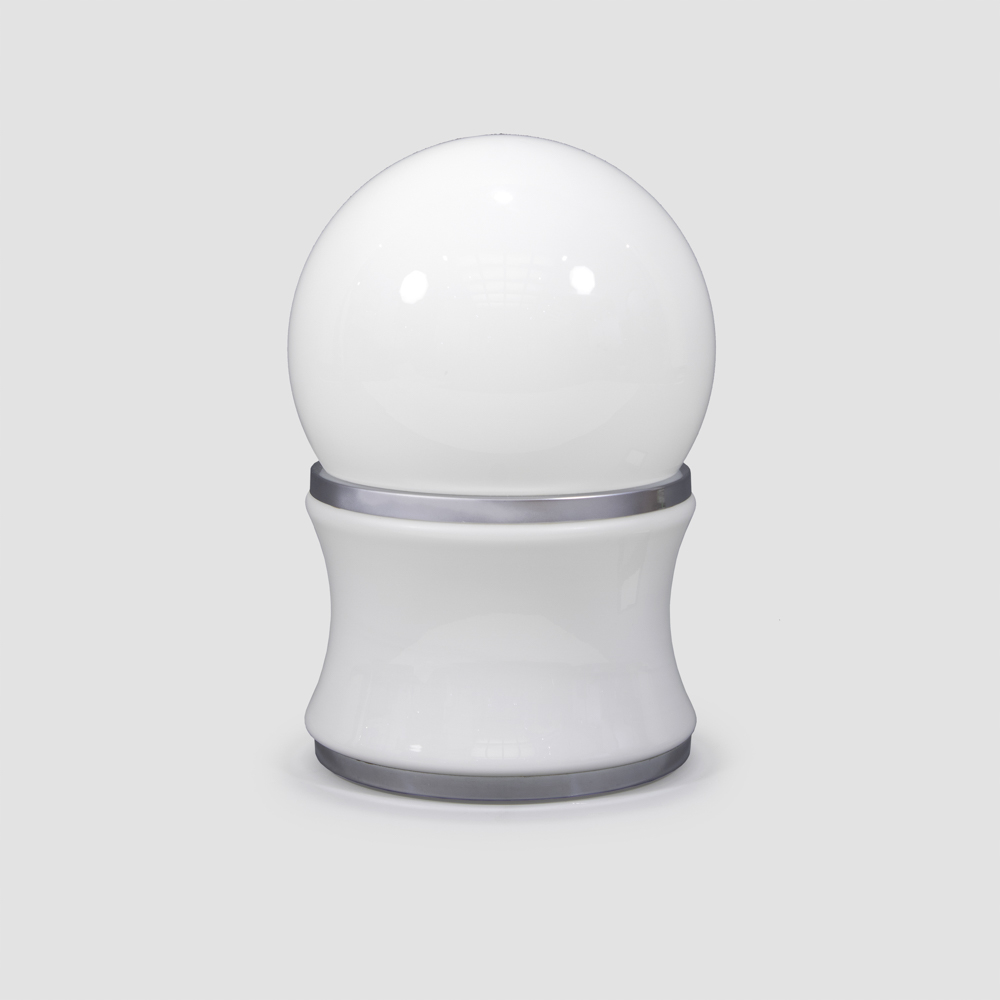lampada da tavolo in acciaio e vetro lattimo
