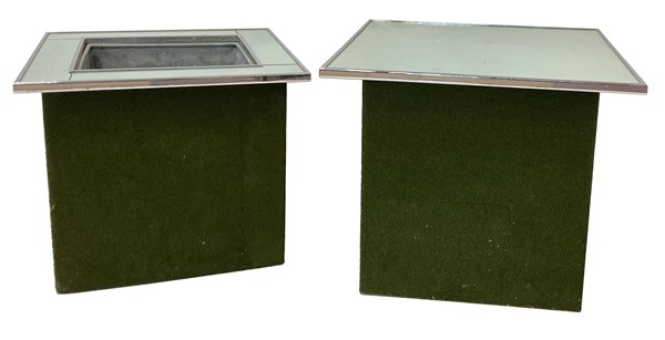 Lotto composto da una fioriera e un tavolino con piano specchiato e bordato in acciaio, corpo parallelepipedo rivestito in moquette verde. Milano, anni '70. (lievi difetti)