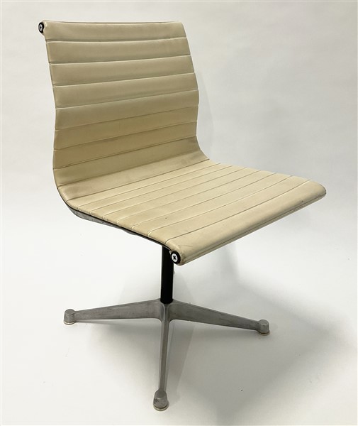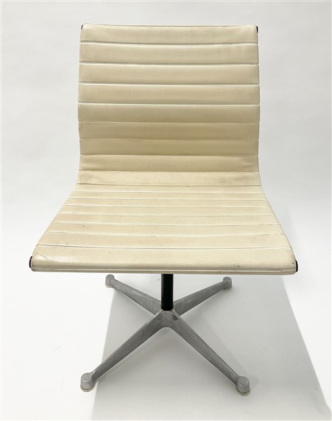 Sedia della serie "Allunium Group". Produzione Herman Miller (disegno del 1958), Italia, anni '50/'60. Struttura in alluminio pressofuso, seduta e schienale rivestiti in vinilpelle bianca.
