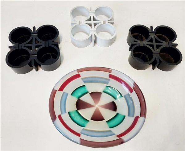 Lotto 752 | Lotto composto da tre posacenere in plastica nera e bianca e un centrotavola in
