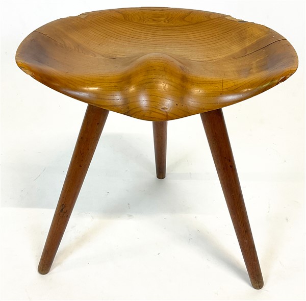 Sgabello tripode con seduta sagomata in legno massello. Secolo XX. (cm 46x50x31)