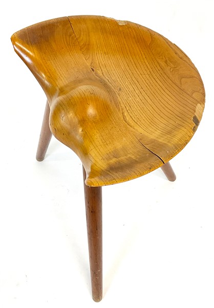 Sgabello tripode con seduta sagomata in legno massello. Secolo XX. (cm 46x50x31