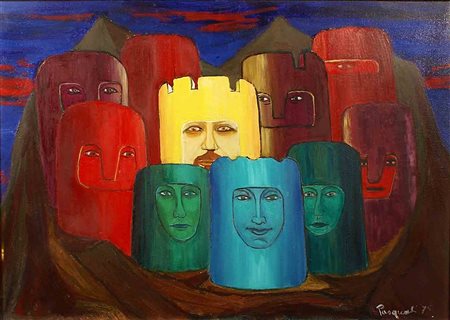 Pasquali (XX secolo), "Totem", acrilico su tela, cm. 50x70, firmato e datato...
