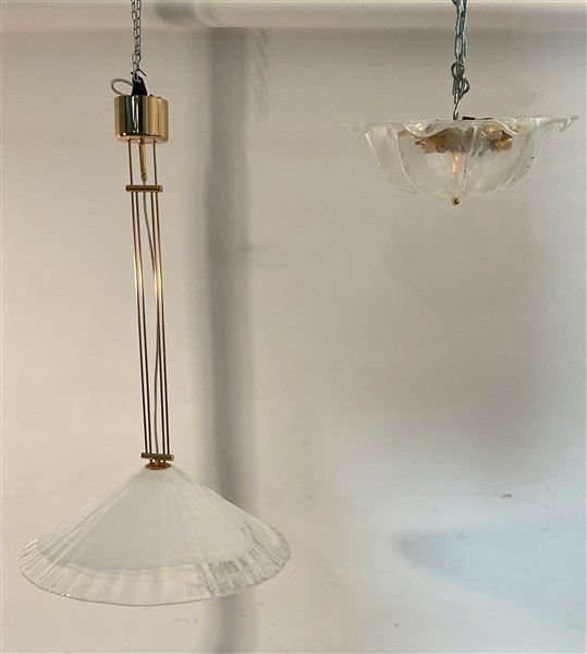 Lotto composto da una plafoniera e una lampada a sospensione in vetro soffiato incolore e lattimo. Struttura in metallo ottonato. Murano, anni '90/2000. Firmate e marcate. (d max cm 60)
