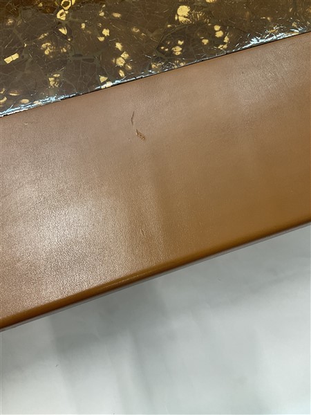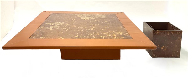 Tavolo da salotto con bordura rivestita in pelle e piano in pelle unito a porta
