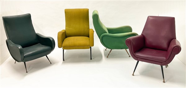 Lotto composto da una poltrona rivestita in similpelle bordeaux, gambe in ferro e puntali in ottone, una poltrona rivestita in similpelle verde, gambe in ferro e puntali in ottone, una poltrona rivestita in velluto verde, gambe in ottone e una poltrona rivestita in tessuto verde-marrone, gambe in ferro e puntali in ottone. Italia, secolo XX. (misure diverse) (difetti e mancanze)