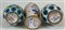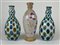 Coppia di bottigliette in ceramica decorata con tondi ocra e blu su fondo bianco uniti a una bottiglietta in ceramica smaltata in bianco e decorata con figura femminile. Faenza, secolo XX. Iscritti sotto la base "Liquori Luxardo Zara, C.M. Faenza". (h max cm 21) (lievi difetti)