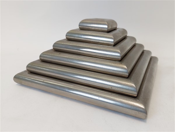 Centrotavola di impianto piramidale composto da moduli scomponibili in metallo.