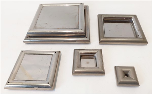 Centrotavola di impianto piramidale composto da moduli scomponibili in metallo. Italia, anni '70. Lotto accompagnato da fotografia in bianco e nero alla gelatina sali d'argento scattata da Maria Mulas che ritrae il centrotavola nel contesto domestico di provenienza. Timbro al retro dell'artista. (difetti)