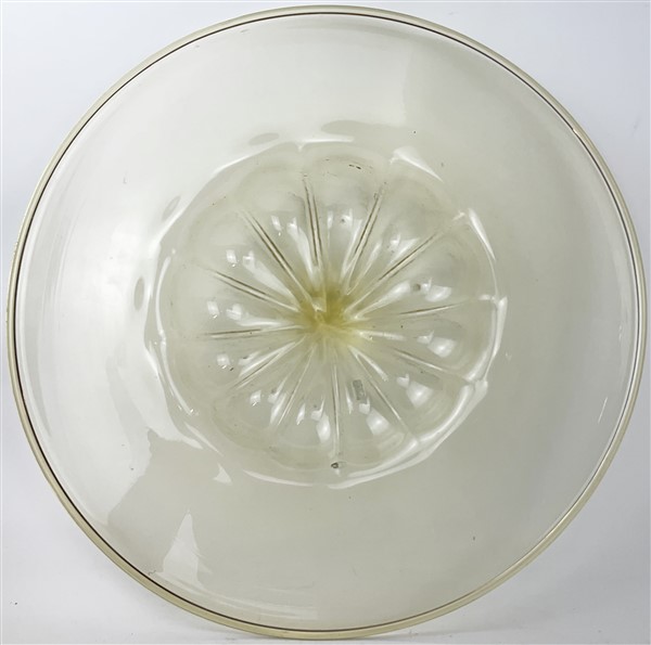 Centrotavola in vetro soffiato trasparente pagliesco con cavetto costolato. Anni '20. (d cm 48)