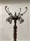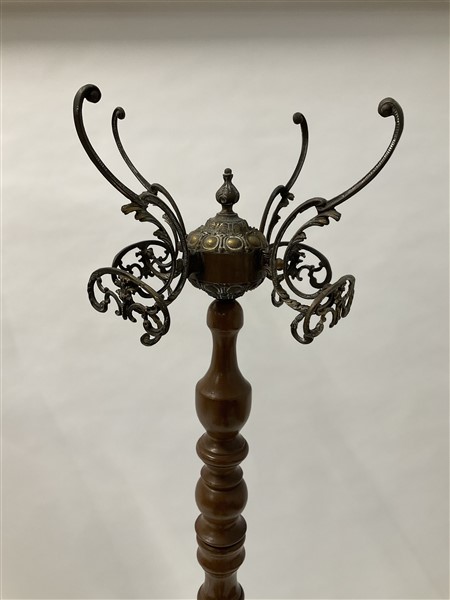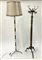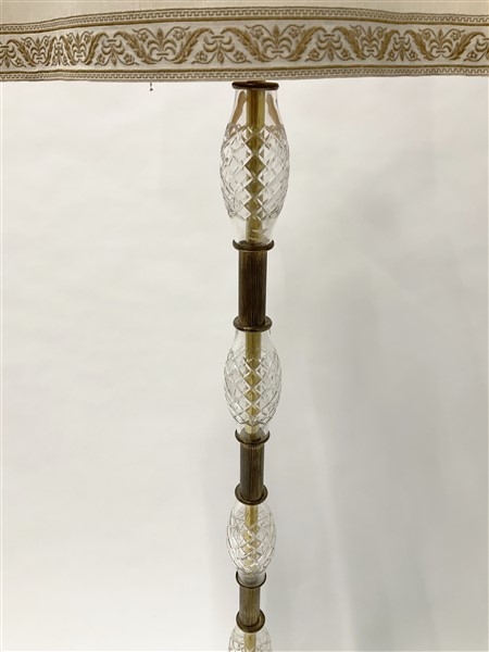 Lampada da terra tripode in ottone con fusto composto da settori alternati da elementi in vetro soffiato a fuso inciso alla mola con decoro romboidale e settori cilindrici in ottone grissinato, paralume non coevo in stoffa (h tot cm 187). Unito ad un appendiabiti tripode con base e ganci in fusione di ottone e fusto torchon. Epoche differenti. (lievi difetti)