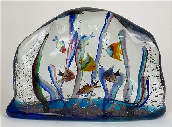 Manifattura di Murano Acquario in vetro sommerso con pesci policromi. (cm 35x23x