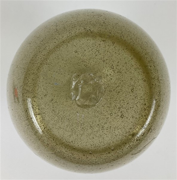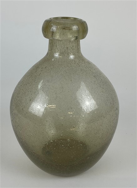 Vasetto bulbiforme in vetro soffiato ambra trasparente con inclusioni di bollicine (h cm 18,5). Seconda metà secolo XX.