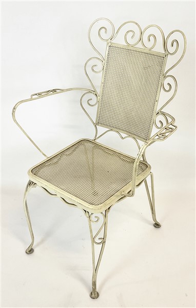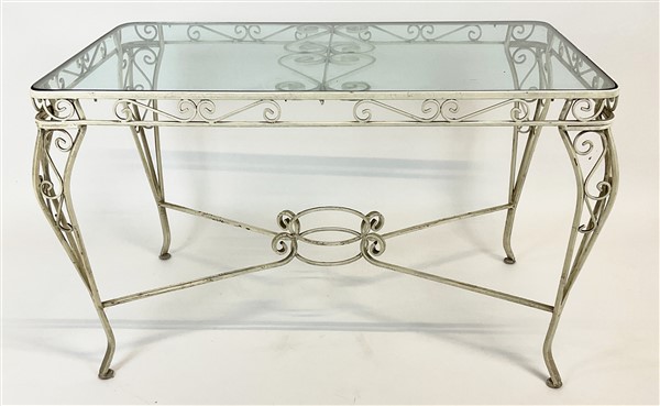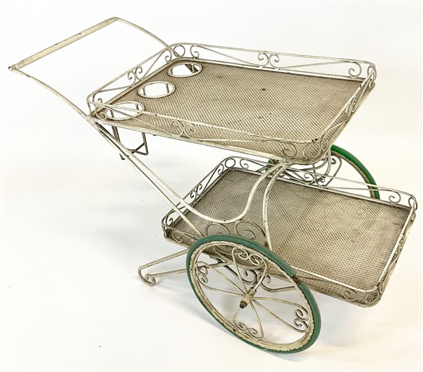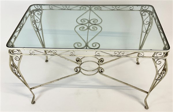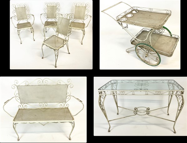 Fornitura da giardino in ferro dipinto bianco composto da divanetto, quattro poltrone, carrellino e tavolo con piano in vetro. Italia, anni '50/'60. (lievi difetti)