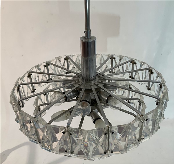Lampada a sospensione con struttura in metallo cromato ed elementi in vetro stampato trasparente incolore. Italia, anni '70. (h cm 77; d cm 52) (lievi difetti)