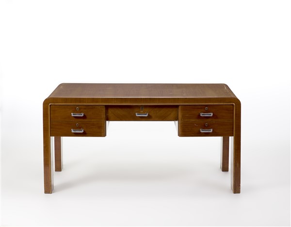Scrivania Novecento da centro a cinque cassetti in legno impiallacciato, sovrappiano in cristallo, maniglie in metallo nichelato. Italia, anni '30. (cm 160,5x81x90,5) (difetti)