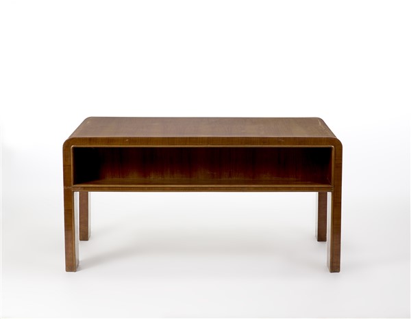 Scrivania Novecento da centro a cinque cassetti in legno impiallacciato, sovrap
