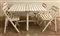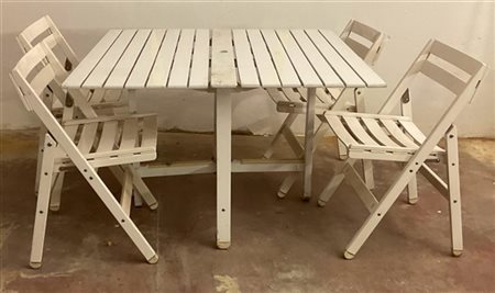 Fornitura da giardino composta da un tavolo e quattro sedie pieghevoli in legno smaltato bianco. Agnosine (Brescia), anni '70/'80. Marchio del produttore. (cm 109x71x113) (difetti)