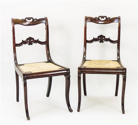 COPPIA DI SEDIE IN NOCE - PAIR OF WALNUT CHAIRS metà del XIX secolo - mid 19th Century cartella intagliata, gambe anteriori mosse, posteriori a sciabola, seduta impagliata, difetti