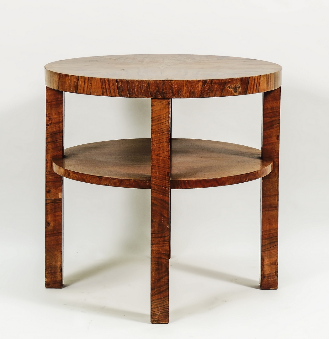 TAVOLINO BASSO IN RADICA DI NOCE - BURR WALNUT TEA TABLE periodo Déco - Deco period piano circolare, gambe dritte riunite da ripiano, difetti h cm 60,5 diam 62,5