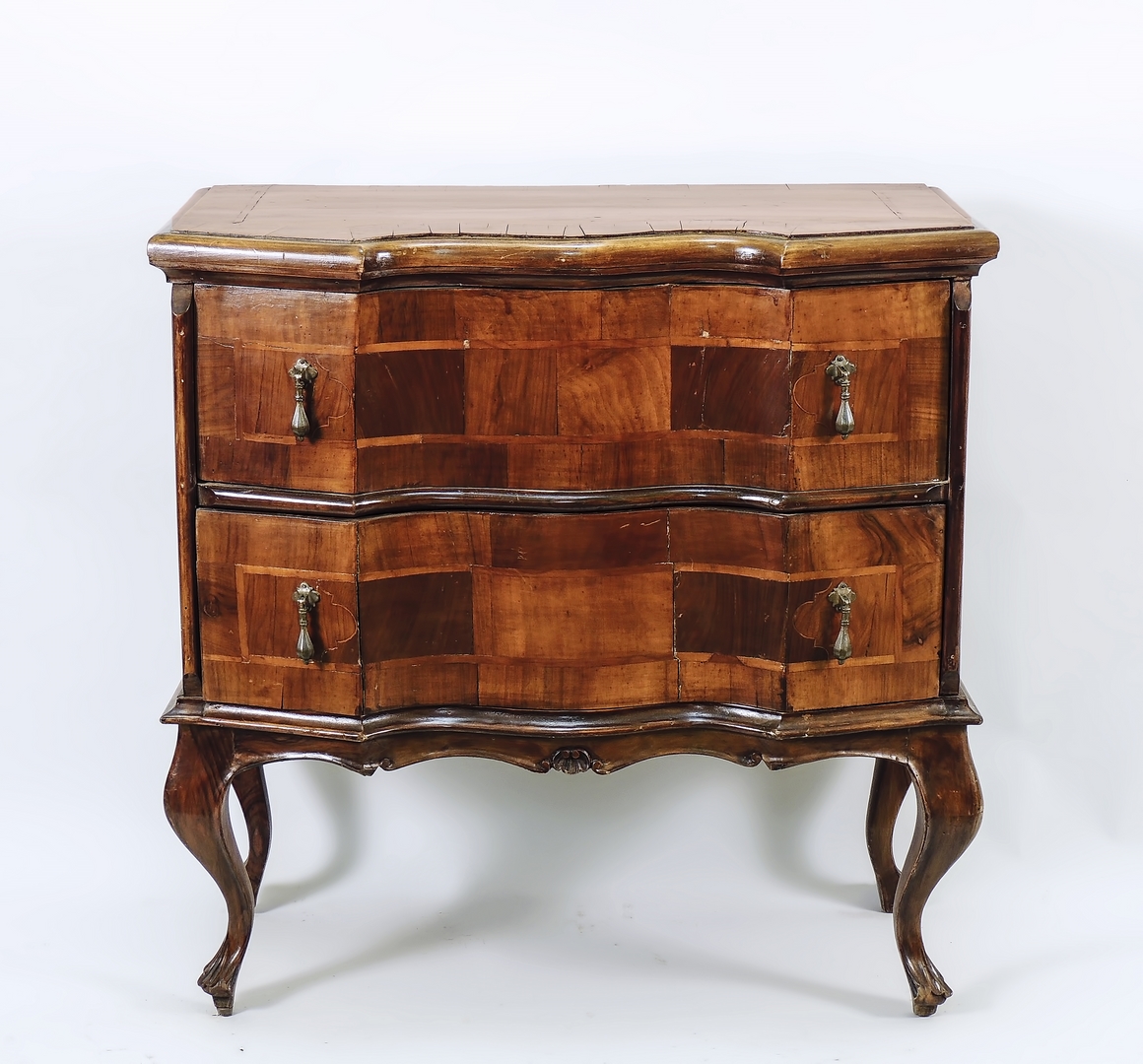 CASSETTONCINO IN NOCE - SMALL WALNUT CHEST OF DRAWERS realizzato in stile settecentesco, piano sagomato, fronte mosso a due cassetti, gambe mosse, lievi difetti h cm 77x76x36,5